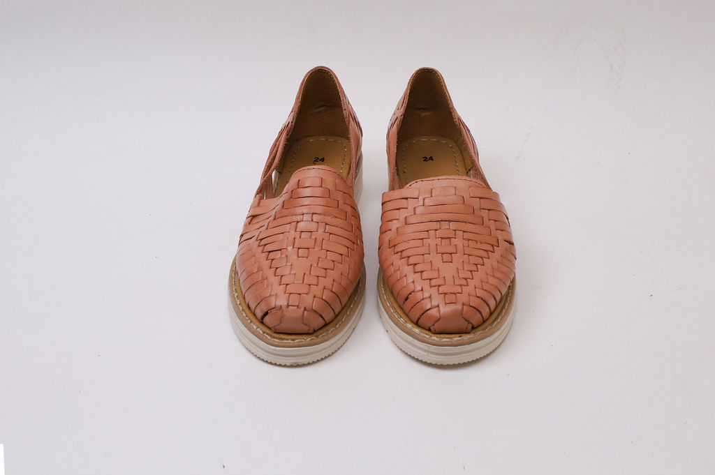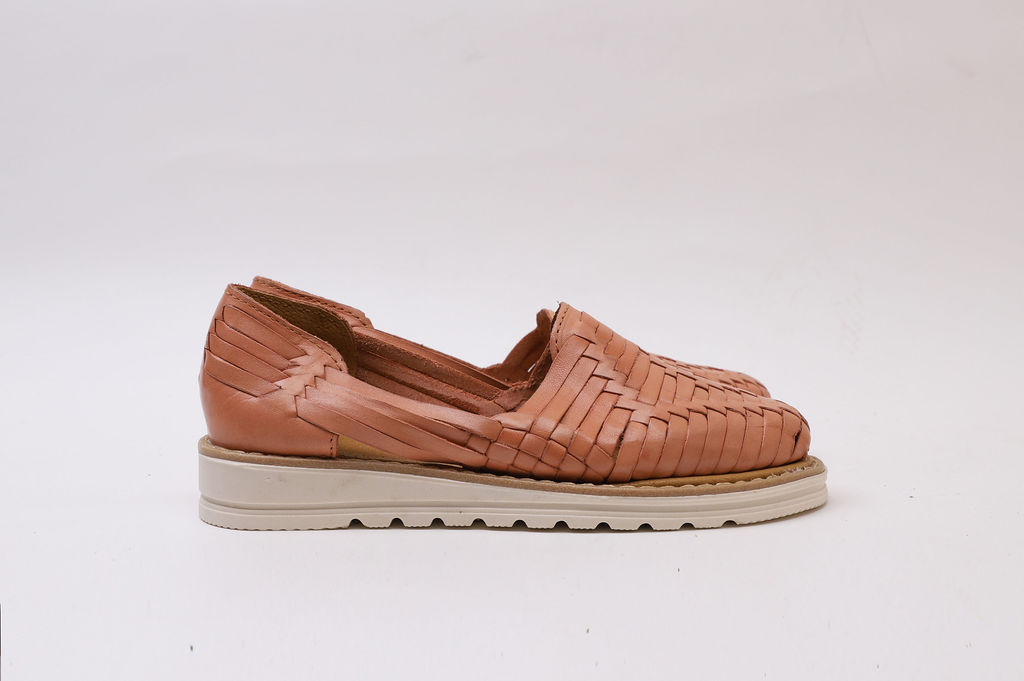 Tejido a mano, piel de res, suela crepe, forro de piel.